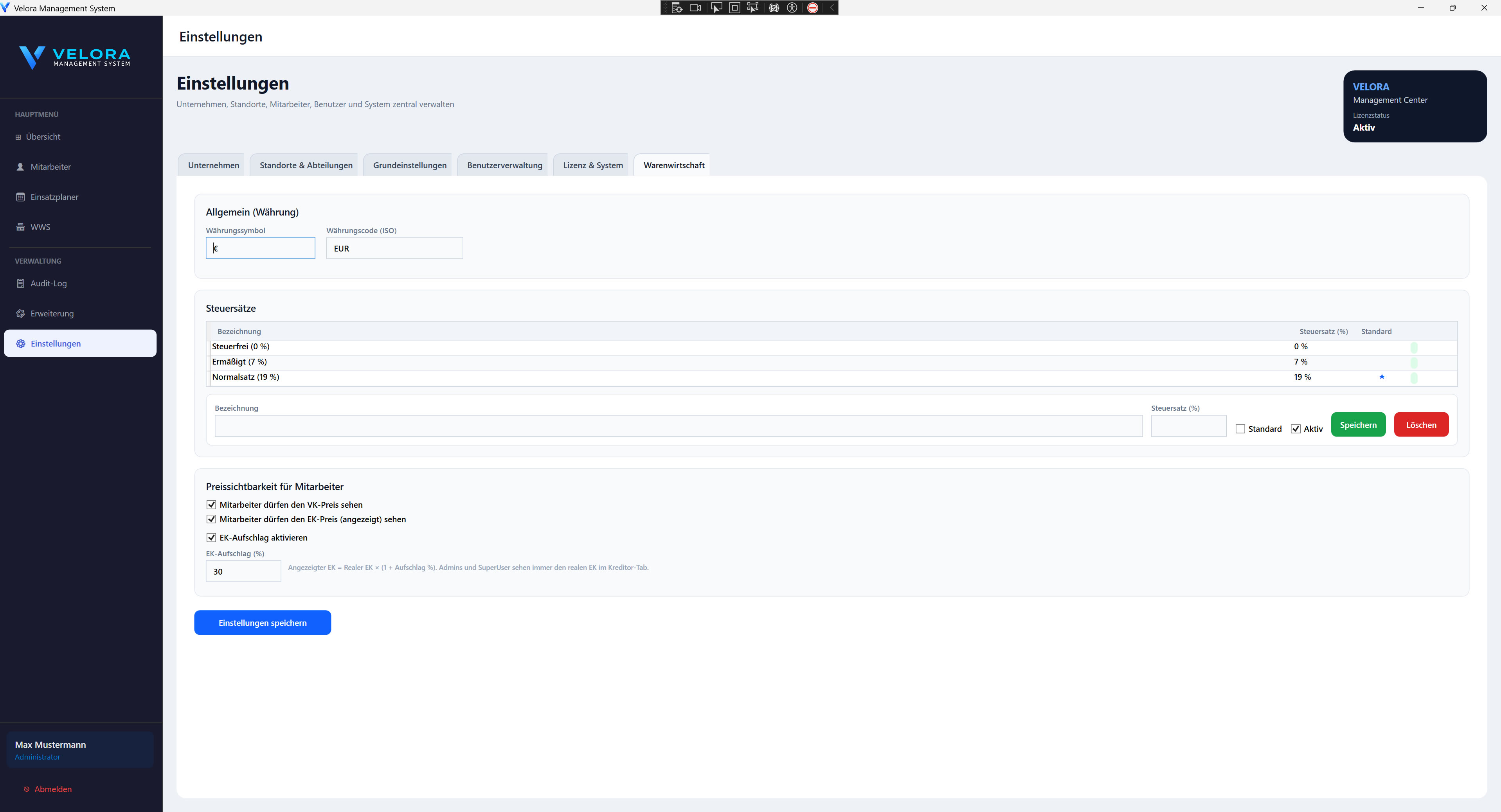 Die Benutzeroberfläche von Velora ist bewusst modern, aufgeräumt und nachvollziehbar gehalten. Ziel ist keine überladene Verwaltungssoftware, sondern ein System, das im Alltag schnell verstanden und effizient genutzt werden kann.