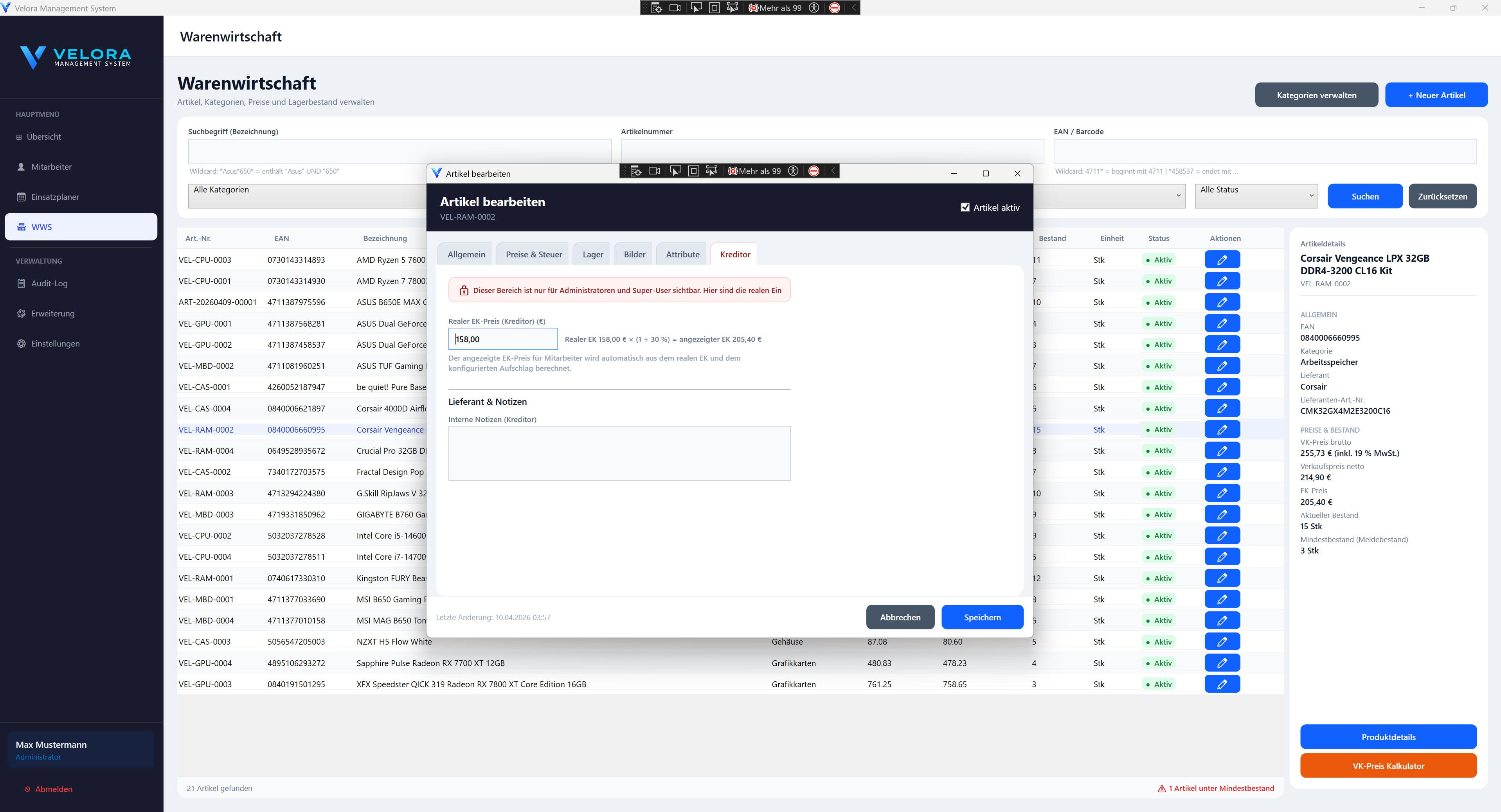 Velora unterstützt die kontrollierte Nutzung durch unterschiedliche Benutzerrollen. Dadurch kann festgelegt werden, welche Bereiche eingesehen oder bearbeitet werden dürfen, was insbesondere in wachsenden Unternehmen für Sicherheit und klare Zuständigkeiten sorgt.