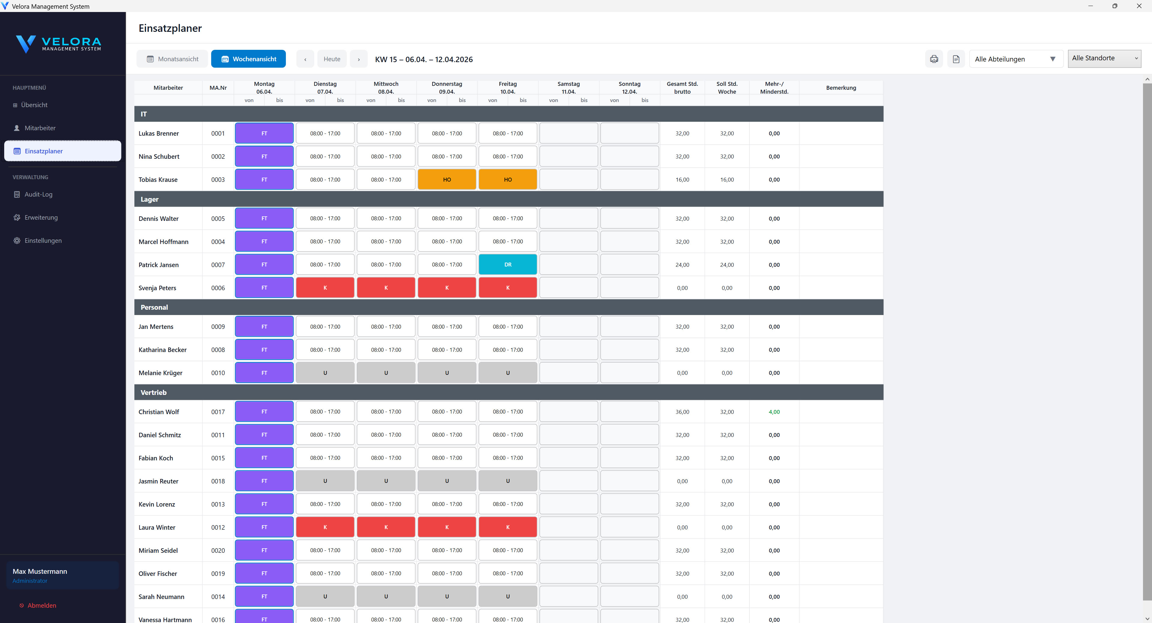 Velora richtet sich an Betriebe, die ihre internen Verwaltungsprozesse professionalisieren möchten, ohne dabei auf unnötig komplexe oder schwer wartbare Systeme angewiesen zu sein. Die Software eignet sich sowohl für einfache Organisationsstrukturen als auch für wachsende Unternehmensmodelle.