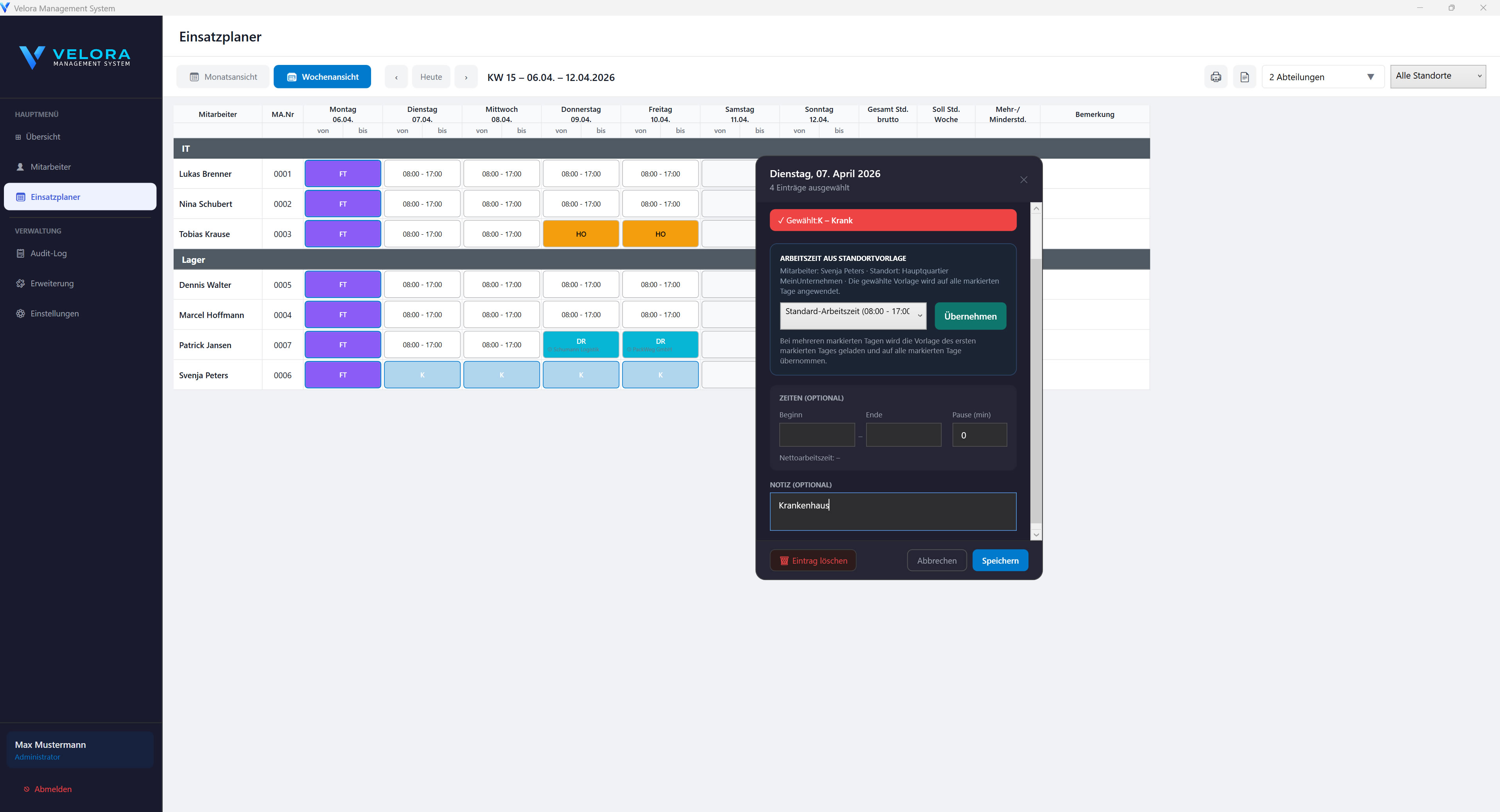 Velora verbindet eine aufgeräumte Benutzeroberfläche mit klar gegliederten Bereichen für Mitarbeiter, Standorte, Abteilungen, Dokumente und organisatorische Prozesse. Die Anwendung wurde so gestaltet, dass Informationen schnell erfasst, sicher verwaltet und im Alltag effizient genutzt werden können.