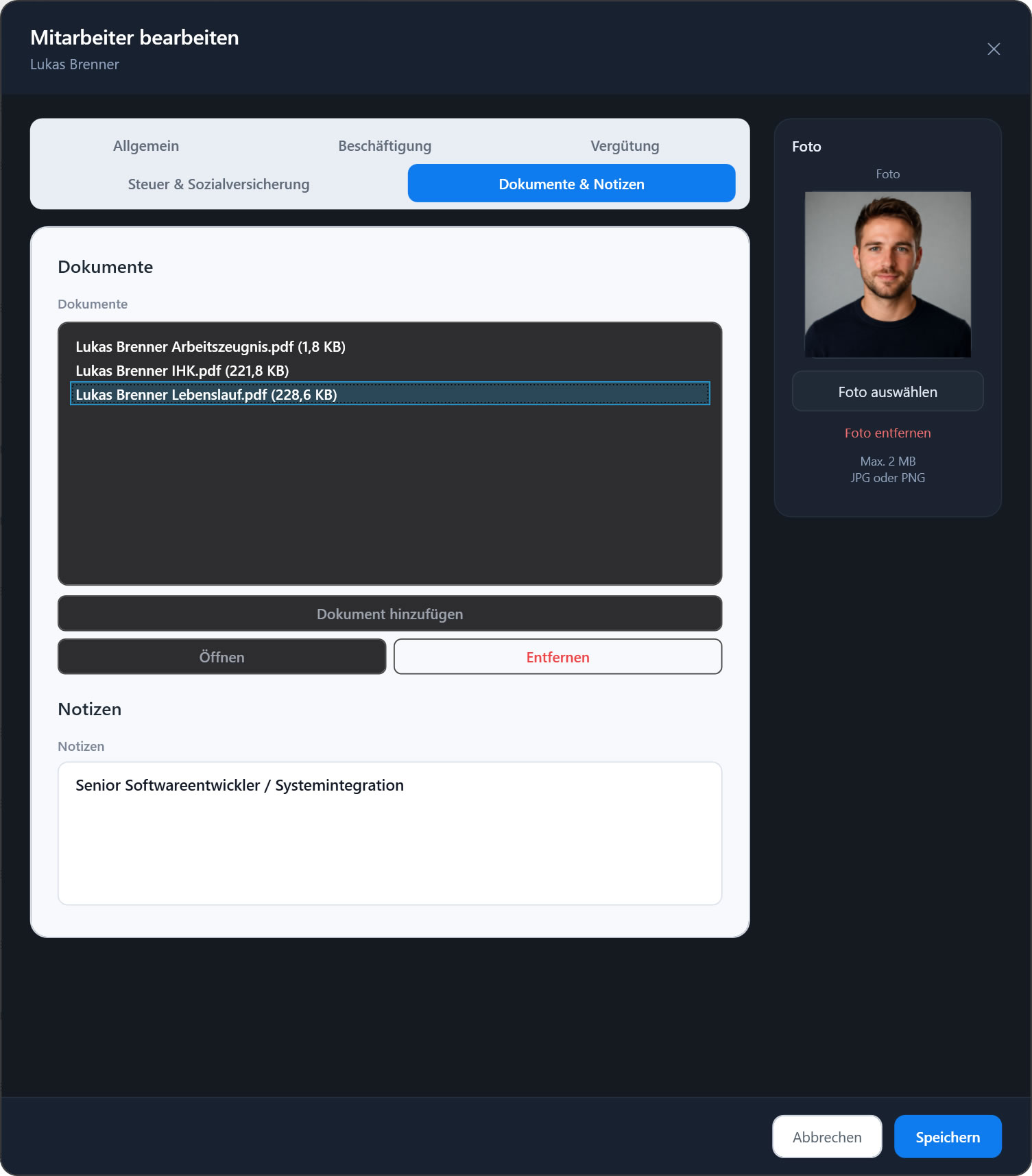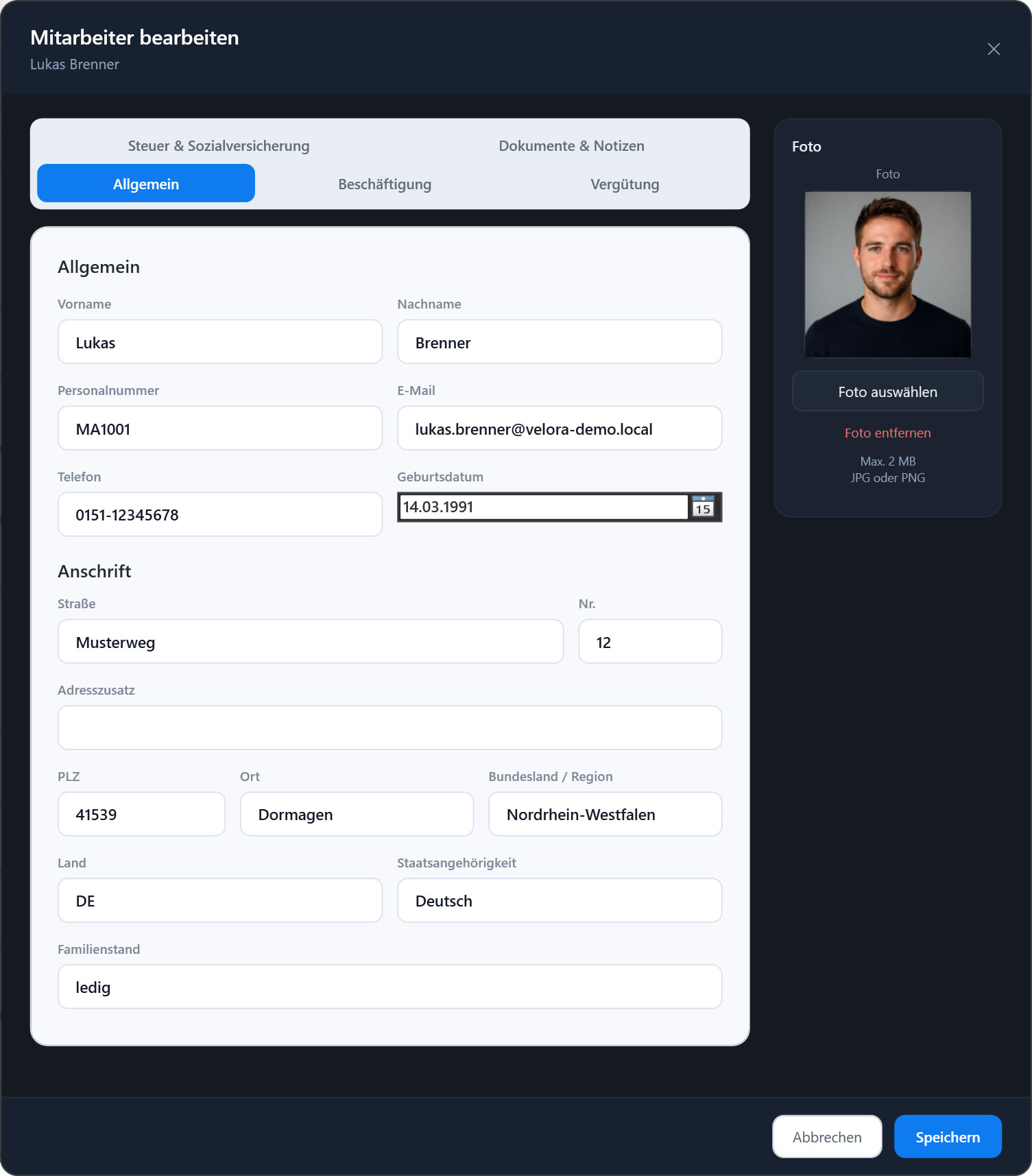 Velora bündelt alle relevanten Mitarbeiterdaten an einem Ort. Persönliche Daten, Kontaktdaten, Beschäftigungsinformationen, Vergütung, Dokumente und weitere organisatorische Angaben können übersichtlich gepflegt und strukturiert verwaltet werden.
