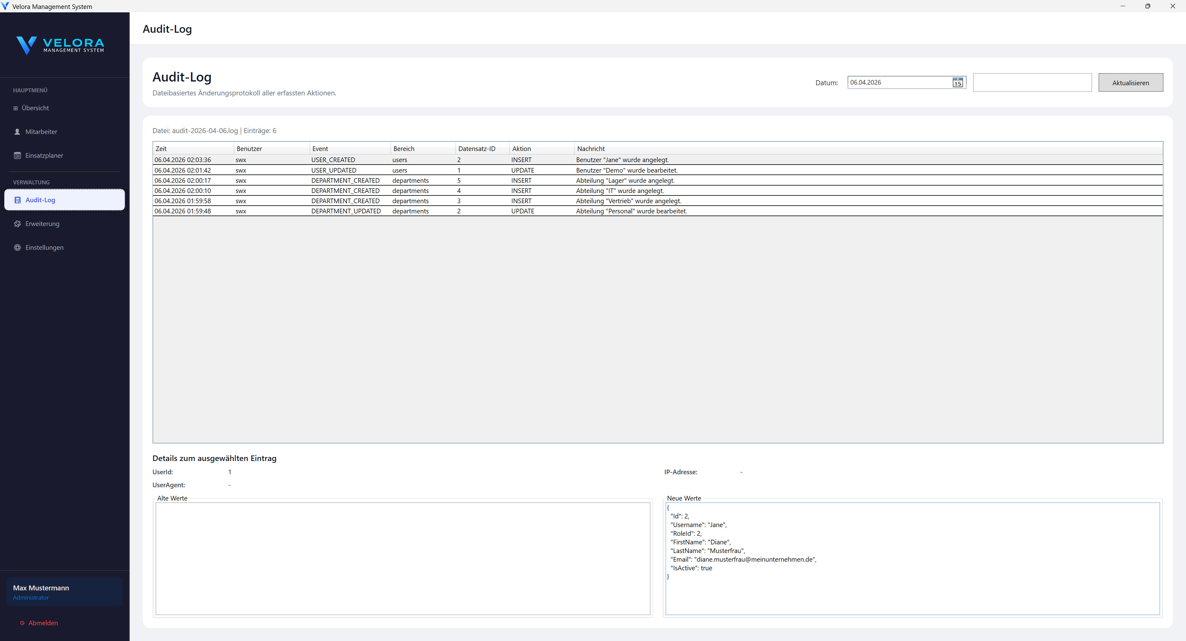 Velora wird derzeit noch entwickelt und ist ein modernes Management System zur zentralen Verwaltung von Mitarbeitern, Standorten, Abteilungen, Benutzerzugängen und organisatorischen Prozessen. Die Software wurde entwickelt, um Verwaltungsabläufe zu vereinfachen, Informationen strukturiert bereitzustellen und Unternehmen eine saubere, professionelle und nachvollziehbare Arbeitsgrundlage zu bieten.Nach Fertigstellung ist Velora hier erhältlich.