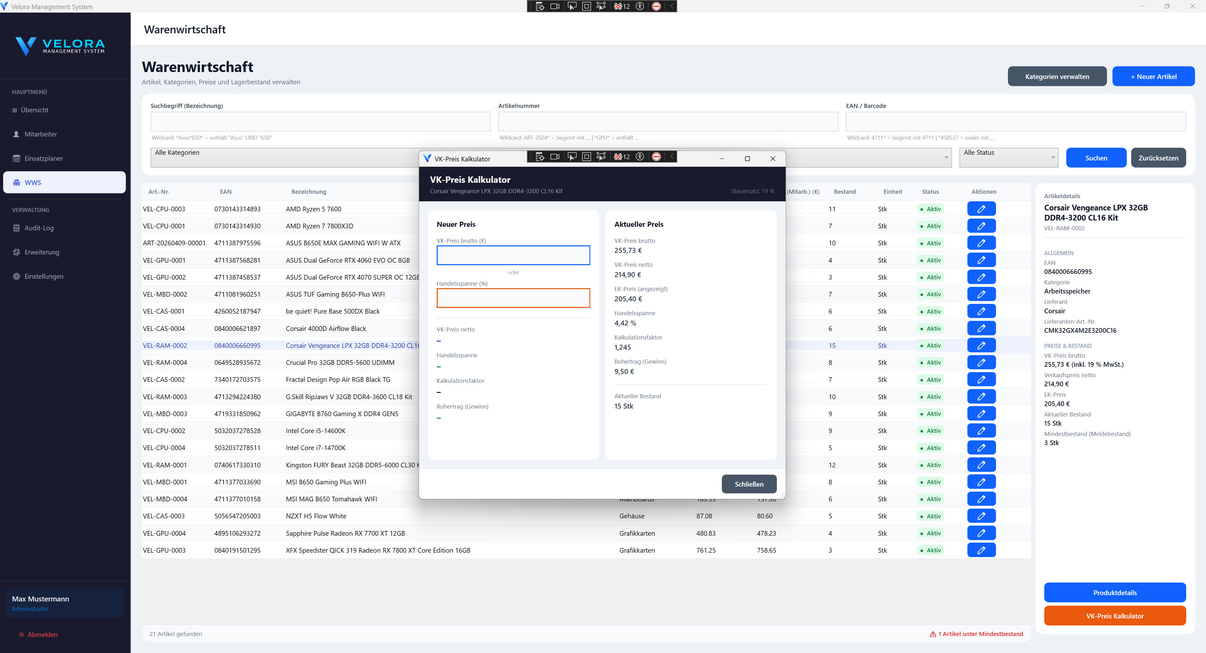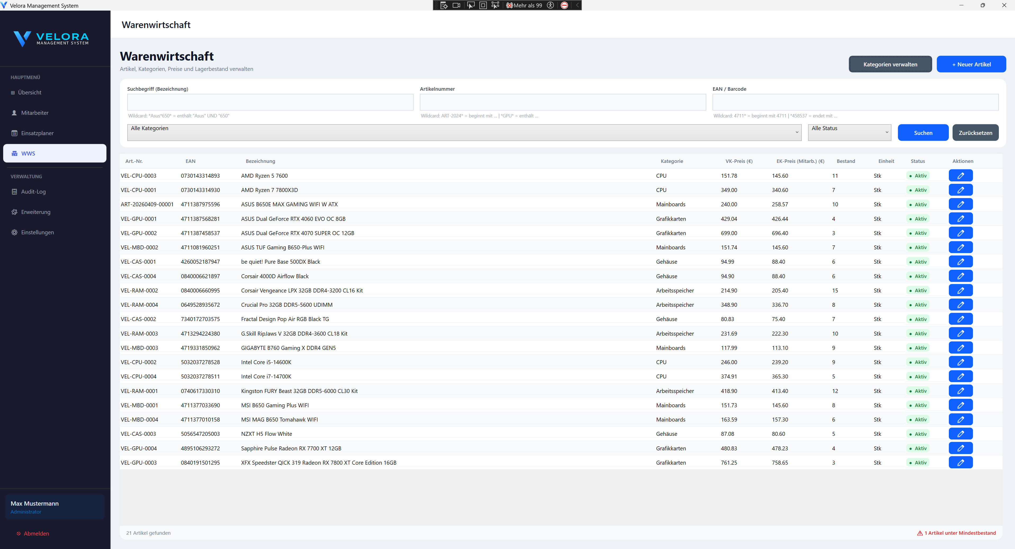 Die Benutzeroberfläche von Velora ist bewusst modern, aufgeräumt und nachvollziehbar gehalten. Ziel ist keine überladene Verwaltungssoftware, sondern ein System, das im Alltag schnell verstanden und effizient genutzt werden kann.