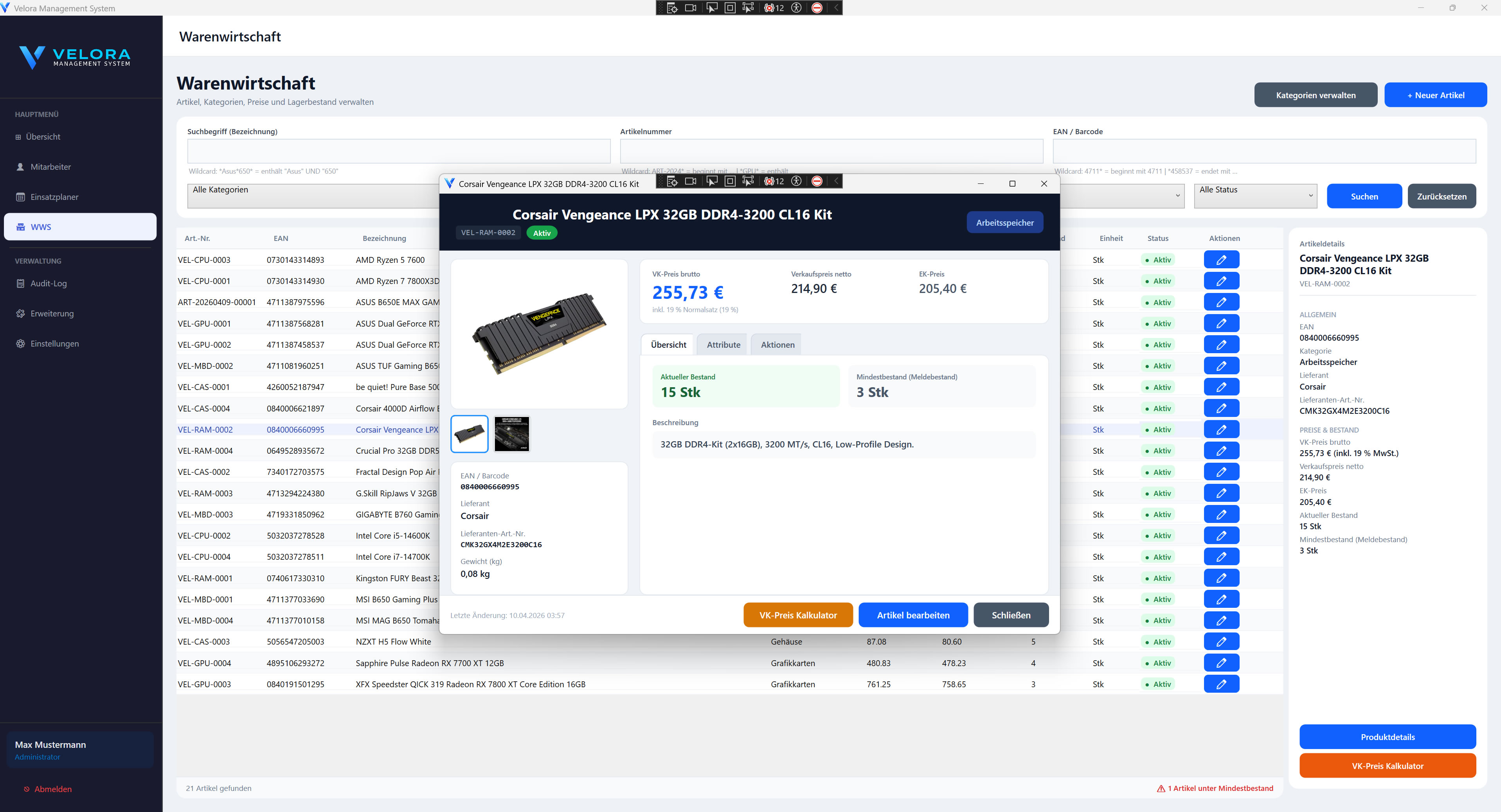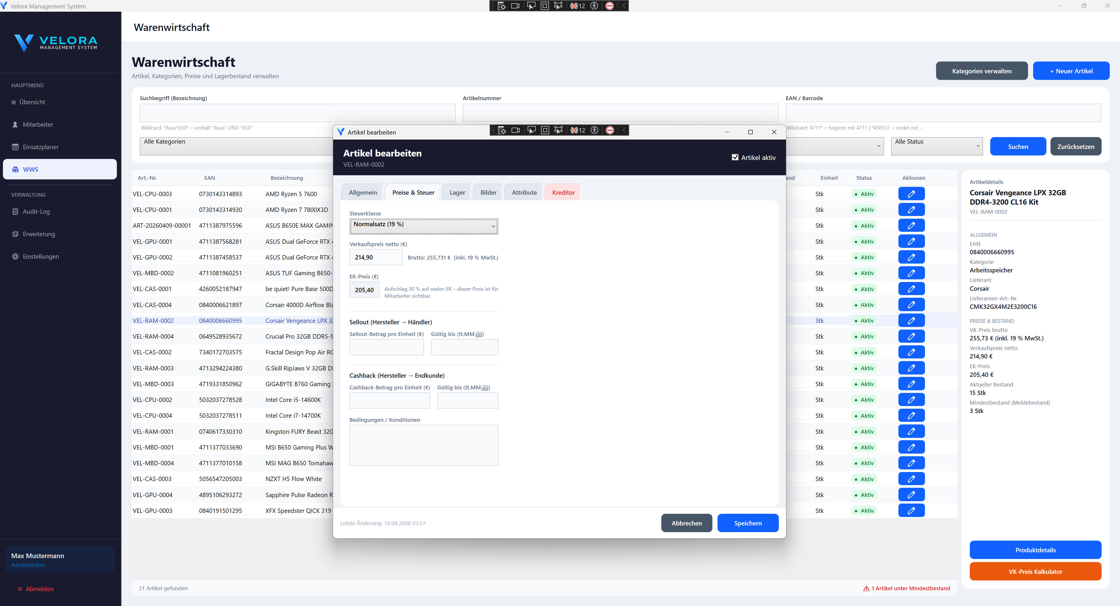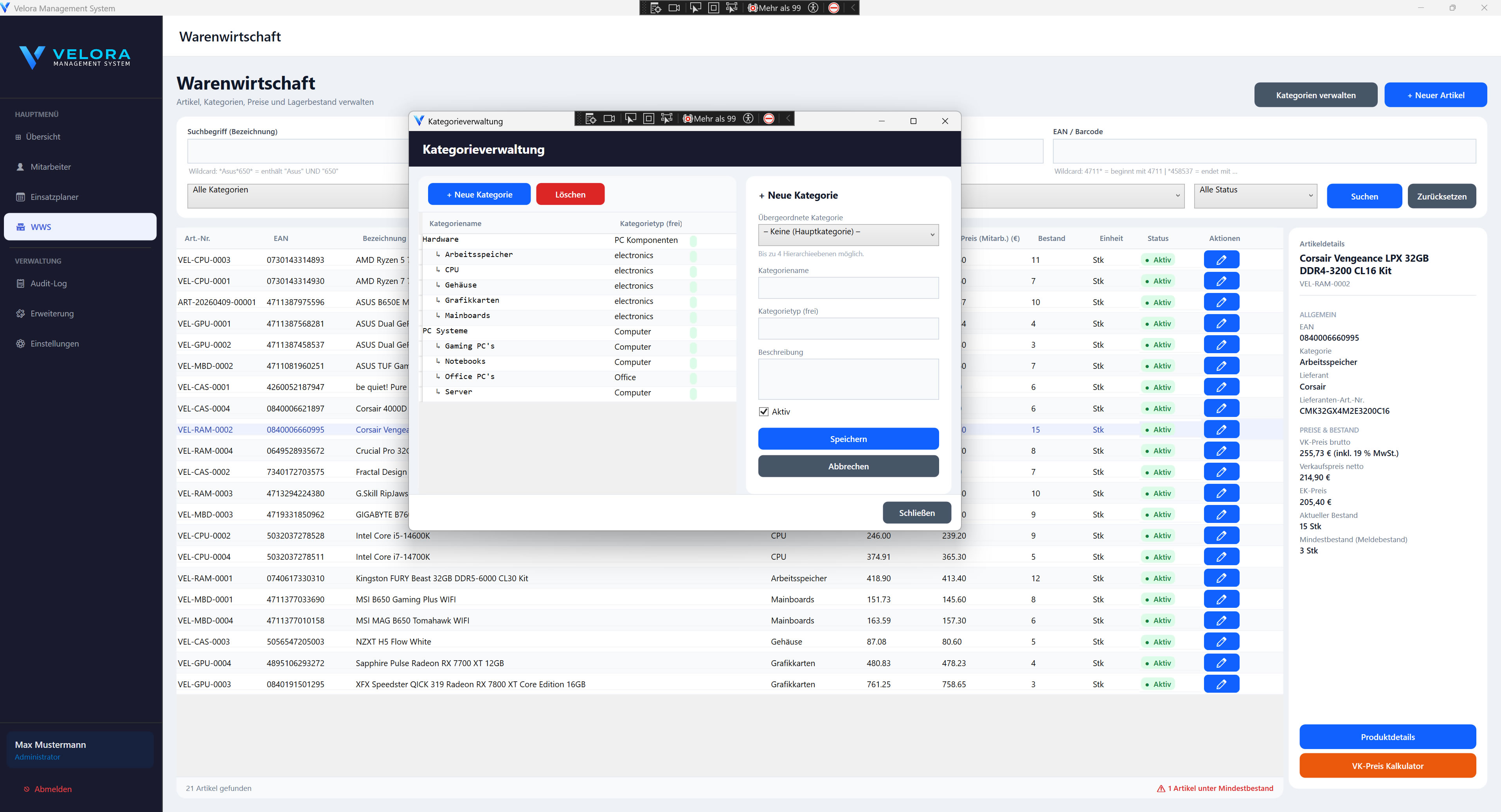 Nachfolgend einige Oberflächen und Funktionsbereiche aus dem Velora Management System (Server Variante). Klicke auf die Vorschau, um die Galerie vergrößert anzusehen.