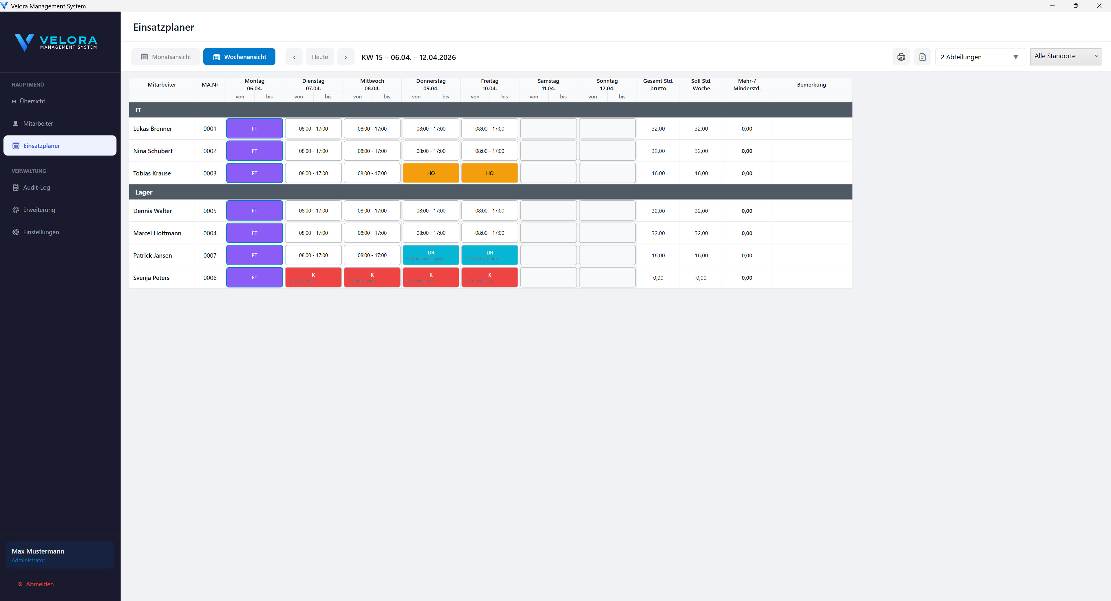 Velora richtet sich an Betriebe, die ihre internen Verwaltungsprozesse professionalisieren möchten, ohne dabei auf unnötig komplexe oder schwer wartbare Systeme angewiesen zu sein. Die Software eignet sich sowohl für einfache Organisationsstrukturen als auch für wachsende Unternehmensmodelle.