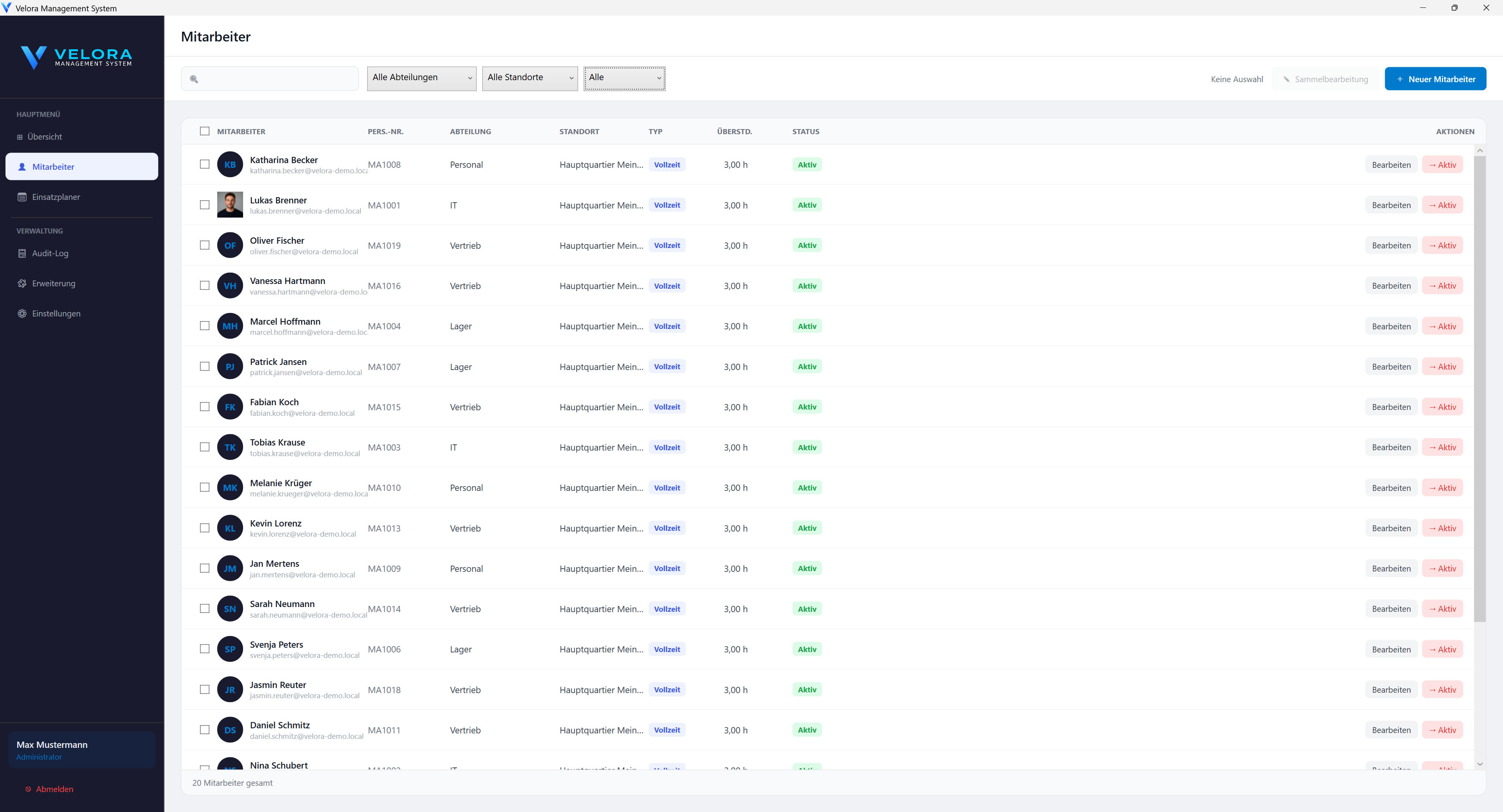 Velora verbindet eine aufgeräumte Benutzeroberfläche mit klar gegliederten Bereichen für Mitarbeiter, Standorte, Abteilungen, Dokumente und organisatorische Prozesse. Die Anwendung wurde so gestaltet, dass Informationen schnell erfasst, sicher verwaltet und im Alltag effizient genutzt werden können.