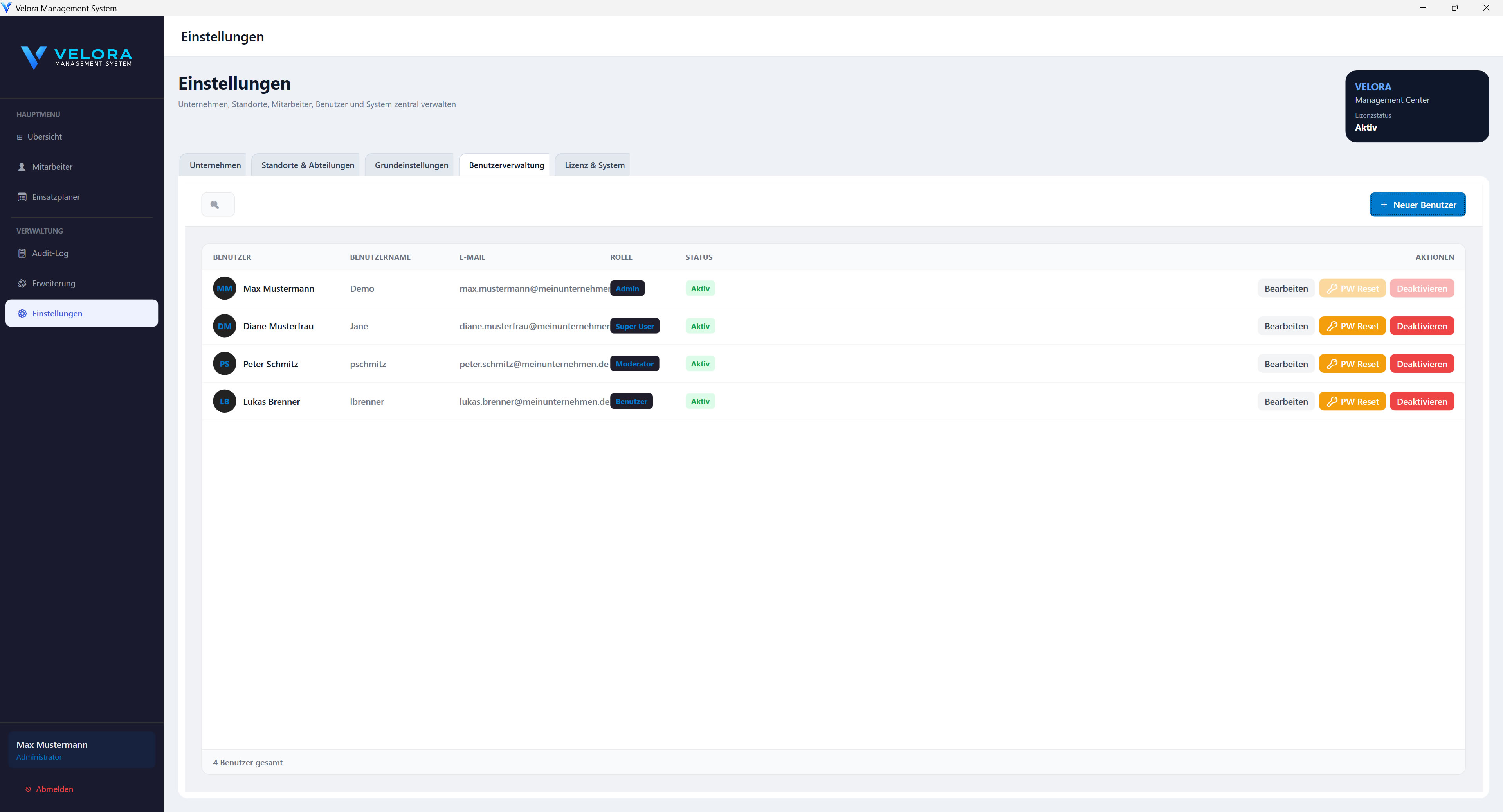 Velora unterstützt die kontrollierte Nutzung durch unterschiedliche Benutzerrollen. Dadurch kann festgelegt werden, welche Bereiche eingesehen oder bearbeitet werden dürfen, was insbesondere in wachsenden Unternehmen für Sicherheit und klare Zuständigkeiten sorgt.