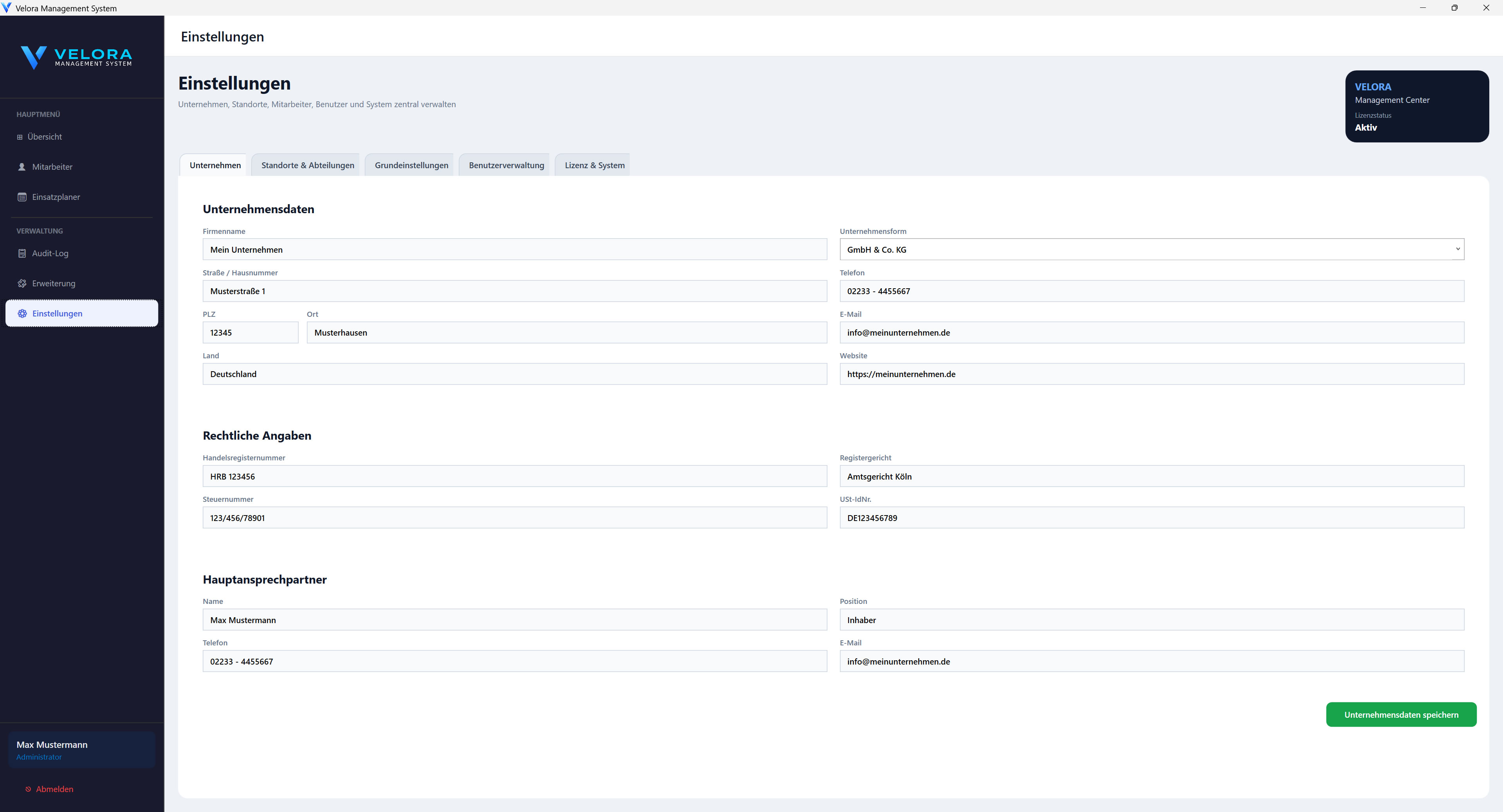 Velora wurde nicht als theoretisches Konzept entworfen, sondern mit dem Ziel, echte betriebliche Anforderungen sinnvoll abzubilden. Der Fokus liegt auf Nutzbarkeit, klarer Struktur und einer professionellen Darstellung im täglichen Einsatz.