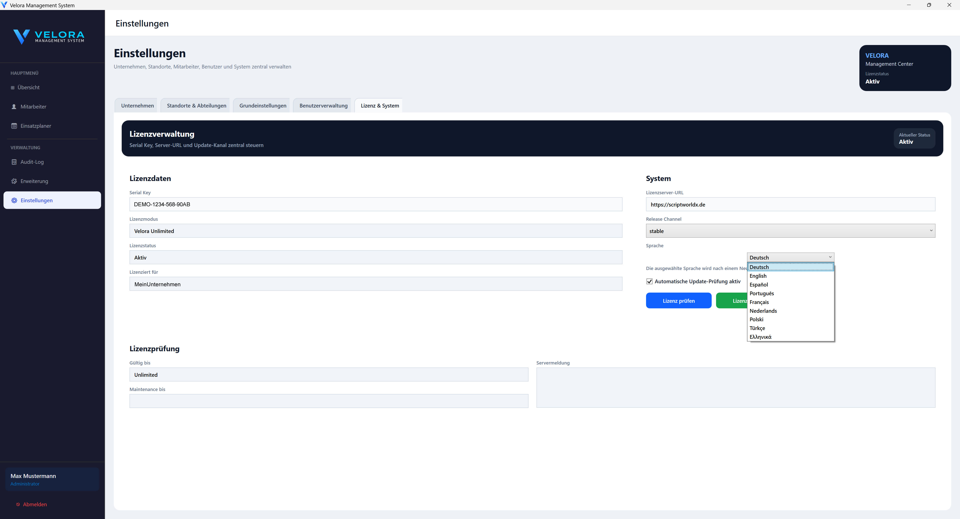 Velora wird derzeit noch entwickelt und ist ein modernes Management System zur zentralen Verwaltung von Mitarbeitern, Standorten, Abteilungen, Benutzerzugängen und organisatorischen Prozessen. Die Software wurde entwickelt, um Verwaltungsabläufe zu vereinfachen, Informationen strukturiert bereitzustellen und Unternehmen eine saubere, professionelle und nachvollziehbare Arbeitsgrundlage zu bieten.Nach Fertigstellung ist Velora hier erhältlich.